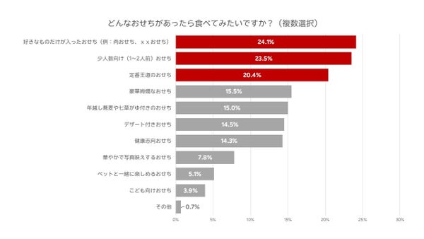 「どんなおせちがあったら食べてみたいか」という質問では、「好きなものだけが入ったおせち」と回答した人が24.1%、「少人数向け(1~2人前)おせち」と回答した人が23.5%と高い割合を占めたことが明らかになっています。「定番王道おせち」も20.4%となり、個々の嗜好やライフスタイルに合わせたおせちへの潜在的なニーズが浮き彫りになっています。