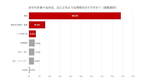 2026年のお正月におせちを食べる人数について質問したところ、「3~4人」と回答した人が56.1%と過半数を占めたことが報告されています。一方で、「2人」と回答した人は22.8%にのぼり、少人数世帯での喫食ニーズも一定数存在することが示されました。また、おせちを「家族」と一緒に食べると回答した人は88.2%に達し、現代においてもおせちが年始の家族団らんの中心的な存在であることがわかります。