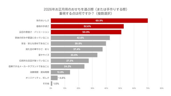 おせちを選ぶ際(または手作りする際)に重視する点の上位3つは、「味のおいしさ」(69.9%)、「価格の手頃さ」(52.6%)、「品目の豊富さ・バリエーション」(50.9%)となりました。家族や大切な人と囲むおせちだからこそ、多くの人がおいしさを最優先する傾向がうかがえます。