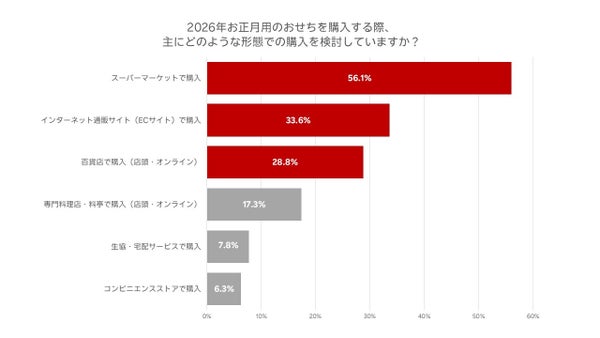 おせちの購入先としては「スーパーマーケット」が56.1%で最も多く、次いで「インターネット通販サイト(ECサイト)」が33.6%、「百貨店」が28.8%という結果になったことがわかります。この調査結果から、多くの人がおせちは全て購入するのではなく、一部でも手作りしたいと考えていることや、何らかの手作りの品を取り入れたいと考えていることが明らかになっています。