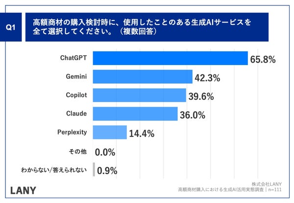 デジタルマーケティング支援事業を展開する株式会社LANY(本社:東京都渋谷区、代表取締役:竹内渓太)が、直近1年以内に生成AIを利用して10万円以上の高額商材を購入した人111名を対象に、高額商材購入における生成AI活用実態調査を実施しました。