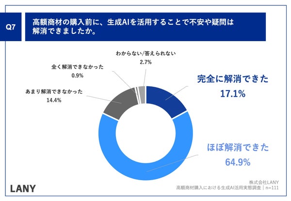 「Q7.高額商材の購入前に、生成AIを活用することで不安や疑問は解消できましたか。」(n=111)と質問したところ、「完全に解消できた」が17.1%、「ほぼ解消できた」が64.9%という回答となりました。