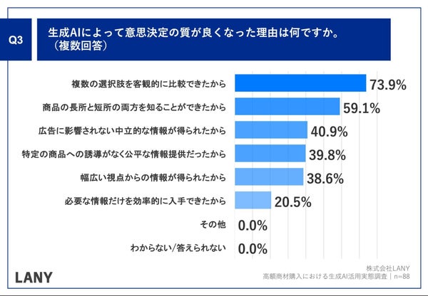Q2で「とても良くなった」「やや良くなった」と回答した方に、「Q3.生成AIによって意思決定の質が良くなった理由は何ですか。(複数回答)」(n=88)と質問したところ、「複数の選択肢を客観的に比較できたから」が73.9%、「商品の長所と短所の両方を知ることができたから」が59.1%、「広告に影響されない中立的な情報が得られたから」が40.9%という回答となりました。