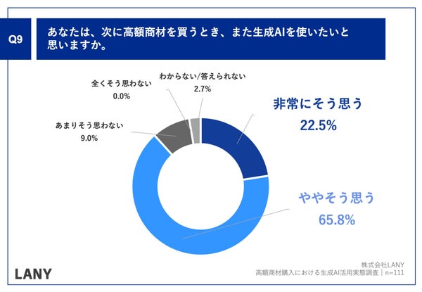 「Q9.あなたは、次に高額商材を買うとき、また生成AIを使いたいと思いますか。」(n=111)と質問したところ、「非常にそう思う」が22.5%、「ややそう思う」が65.8%という回答となりました。
