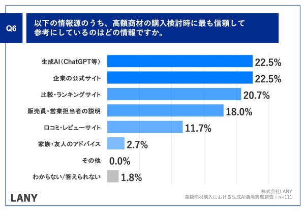 「Q6.以下の情報源のうち、高額商材の購入検討時に最も信頼して参考にしているのはどの情報ですか。」(n=111)と質問したところ、「生成AI(ChatGPT等)」が22.5%、「企業の公式サイト」が22.5%、「比較・ランキングサイト」が20.7%という回答となりました。