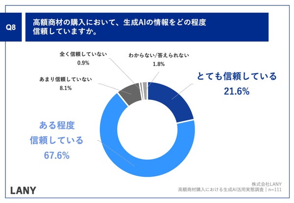 「Q8.高額商材の購入において、生成AIの情報をどの程度信頼していますか。」(n=111)と質問したところ、「とても信頼している」が21.6%、「ある程度信頼している」が67.6%という回答となりました。