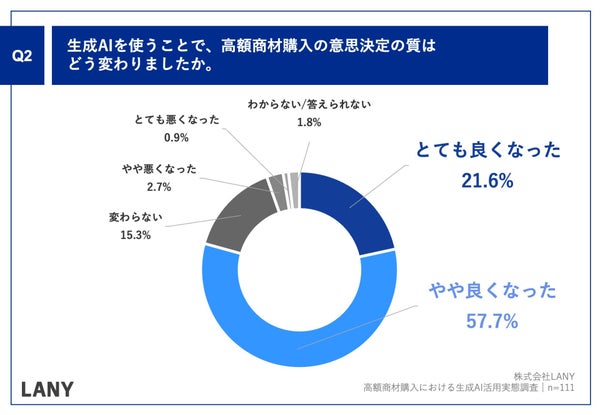 「Q2.生成AIを使うことで、高額商材購入の意思決定の質はどう変わりましたか。」(n=111)と質問したところ、「とても良くなった」が21.6%、「やや良くなった」が57.7%という回答となりました。合計で約8割の人が意思決定の質が向上したと感じています。