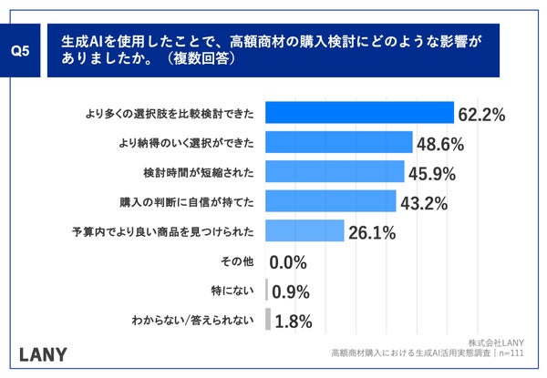 「Q5.生成AIを使用したことで、高額商材の購入検討にどのような影響がありましたか。(複数回答)」(n=111)と質問したところ、「より多くの選択肢を比較検討できた」が62.2%、「より納得のいく選択ができた」が48.6%、「検討時間が短縮された」が45.9%という回答となりました。