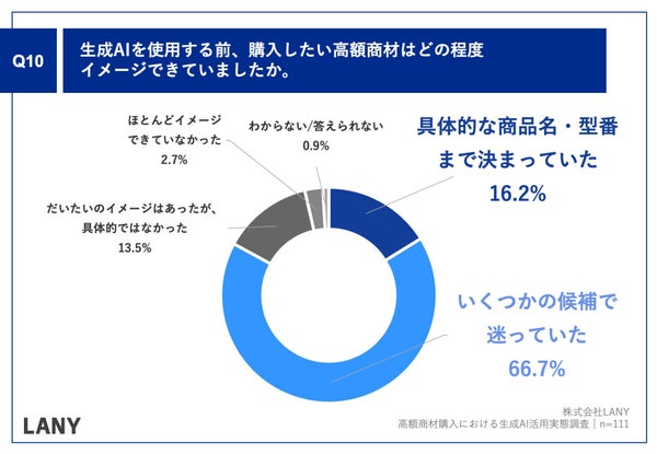 「Q10.生成AIを使用する前、購入したい高額商材はどの程度イメージできていましたか。」(n=111)と質問したところ、「具体的な商品名・型番まで決まっていた」が16.2%、「いくつかの候補で迷っていた」が66.7%という回答となりました。