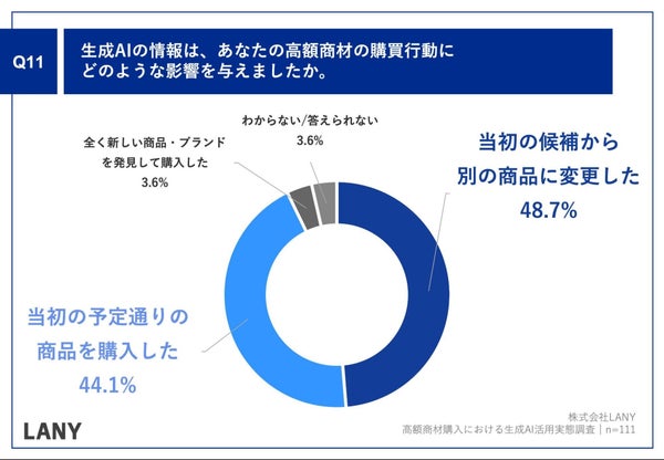 「Q11.生成AIの情報は、あなたの高額商材の購買行動にどのような影響を与えましたか。」(n=111)と質問したところ、「当初の予定通りの商品を購入した」が44.1%、「当初の候補から別の商品に変更した」が48.7%という回答となりました。