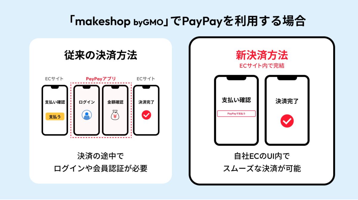 このような背景を踏まえ、GMOメイクショップ株式会社はEC事業者の売上最大化と購入者への快適な購買体験提供を目指し、自社ECサイトのユーザーインターフェース上で「PayPay」決済が完結できる新機能の提供を開始しました。これは「PayPay」の新機能をダイレクト連携することで実現したもので、購入者はECサイトから離れることなく、よりスムーズに決済を行うことができるようになります。