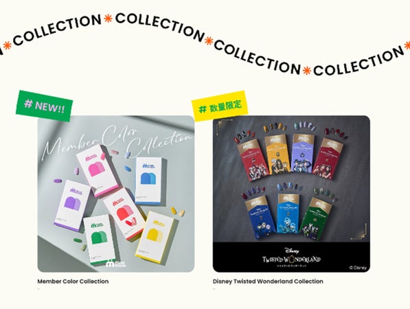 第1弾コレクションとして、ディズニーキャラクターとのコラボレーションコレクションや、アイドルグループなどで個々のメンバーのイメージを表現する「メンバーカラー(通称:メンカラ)」を楽しめるデザインが発売されています。今後も複数のIPやインフルエンサーとのコラボレーション商品の展開が予定されているようです。