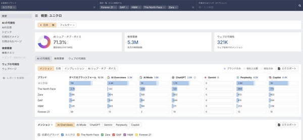 • 競合分析:特定のクエリだけでなく、競合ブランドの言及を俯瞰し、これまで見逃していた露出機会を発見