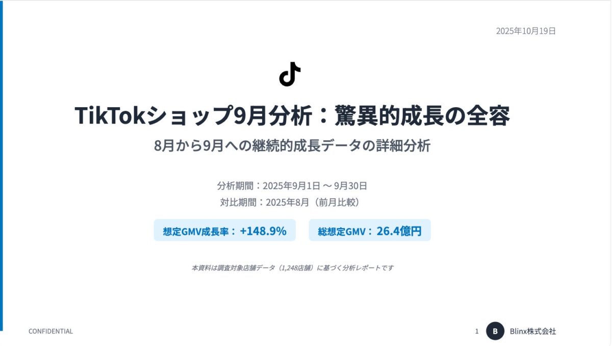 Blinx株式会社は、TikTok Shopの実績データ1,248社分をもとに9月の市場動向をまとめた「9月月間レポート(全54ページ・詳細分析付き)」を公開したことを発表しました。このレポートによると、9月のGMVは約26.4億円(前月比+148.9%)、販売112.9万件、平均単価2,171円となり、"高単価×高収益"への転換が加速していることが明らかになっています。