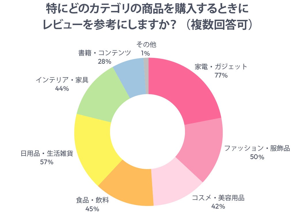 調査ではレビューを特に参考にするジャンルについても質問が行われ、家電・ガジェット(77%)、日用品・生活雑貨(57%)、ファッション・服飾品(50%)が上位に挙げられたとのことです。