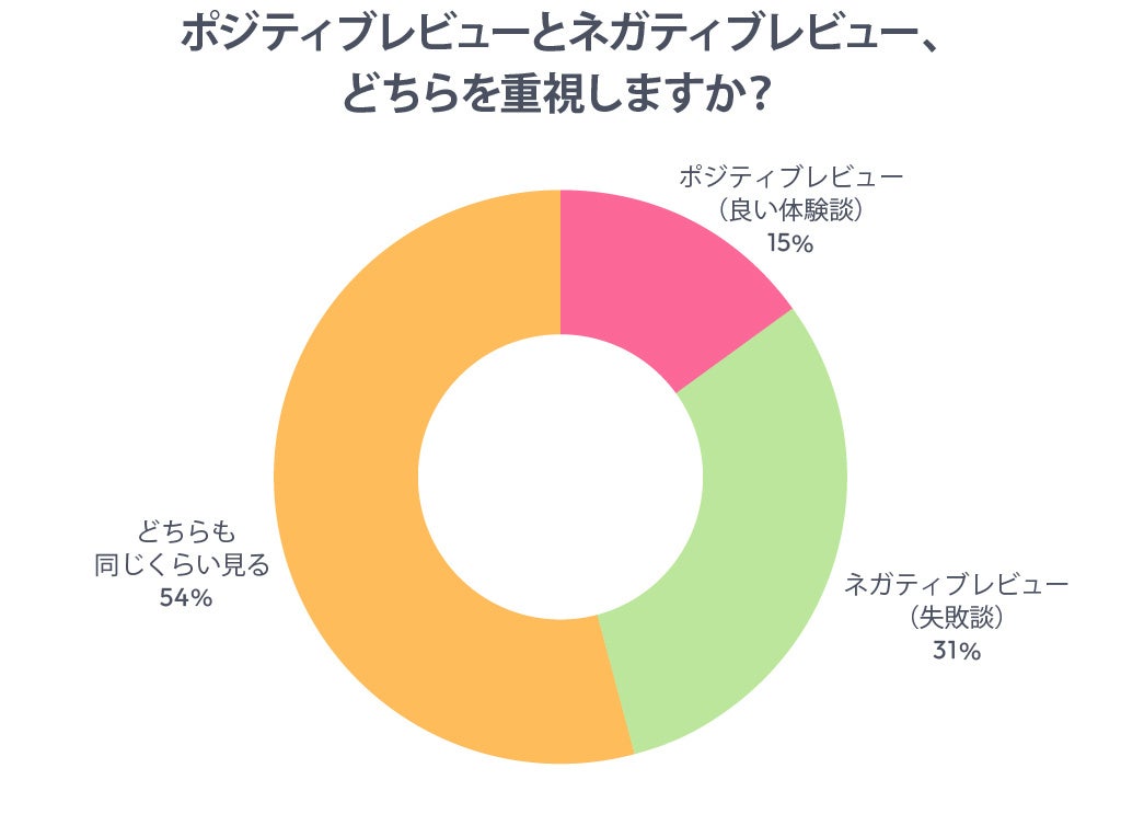 「ポジティブレビューとネガティブレビューのどちらを重視しますか?」という質問では、「ネガティブレビュー(失敗談)」を重視すると答えた人が31%、「どちらも同じくらい見る」という回答が54%となり、合計85%以上の人が失敗談にも目を通していることがわかったと報告されています。