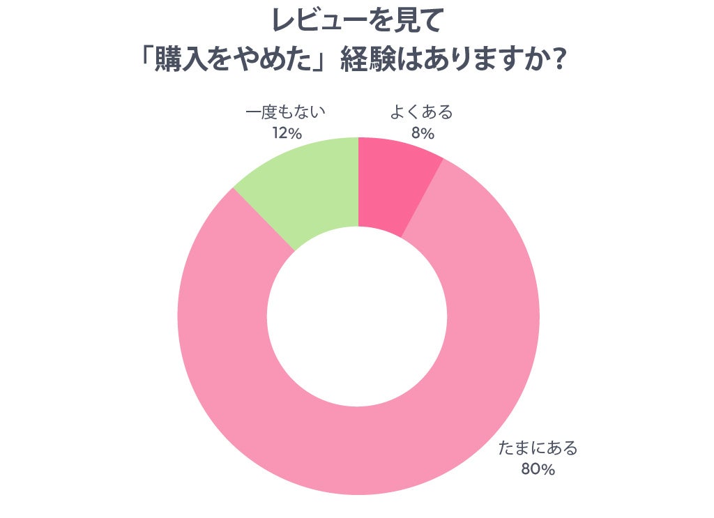 また、「レビューを見て購入をやめたことがある」と答えた人は88%(「よくある」8%+「たまにある」80%)にも達しており、ネガティブレビューが購入を思いとどまらせる要因になっていることも明らかになりました。