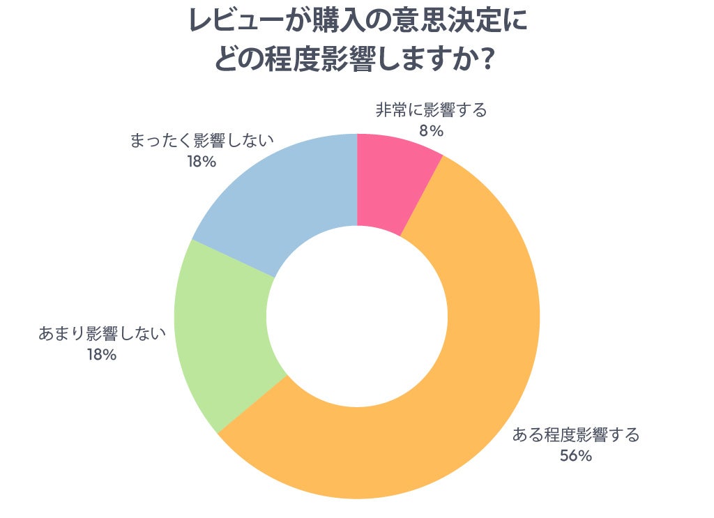 レビューが購入意思決定にどの程度影響するかについての質問では、「非常に影響する」(8%)、「ある程度影響する」(56%)を合わせて64%の回答者がレビューに購入判断が左右されると答えたそうです。