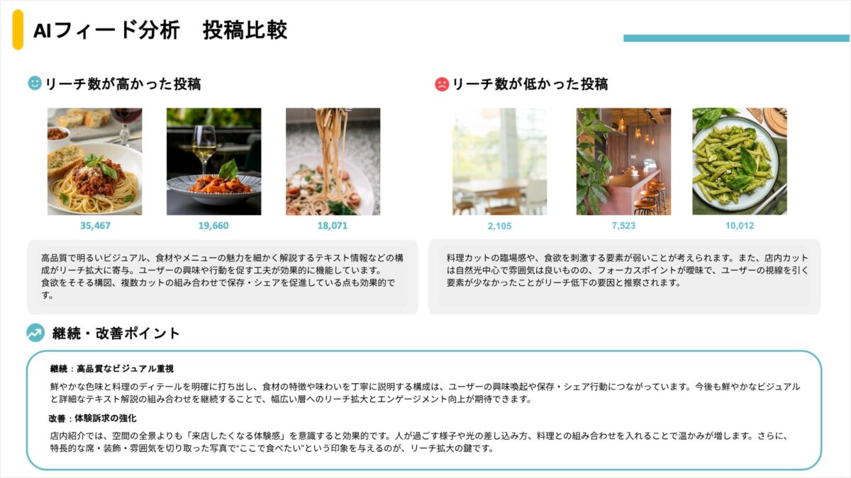 • パフォーマンス分類と傾向分析:投稿の成果に基づいて、上位・下位の投稿を自動的に分類し、それぞれの共通点や改善提案を提示します。これによって、効果的な投稿の特徴を理解し、今後の投稿戦略に活かすことが可能になります。