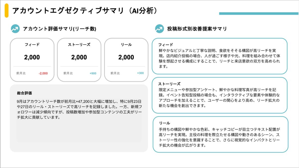 • 投稿データの自動解析:前月以前のInstagram投稿を対象として、AIがアカウント全体および投稿形式別の運用状況を自動的に整理します。これにより、投稿パフォーマンスの全体像を簡単に把握できるようになります。