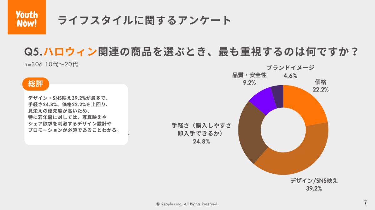 株式会社Reaplus(本社:東京都渋谷区、代表取締役:松元 詞音)は、消費者の"今"を可視化する次世代型インサイトマーケティングサービス「Youth Now!」を活用して、全国の15〜29歳の男女489名を対象とした「ハロウィンにおける参加/消費行動調査」を実施しました。