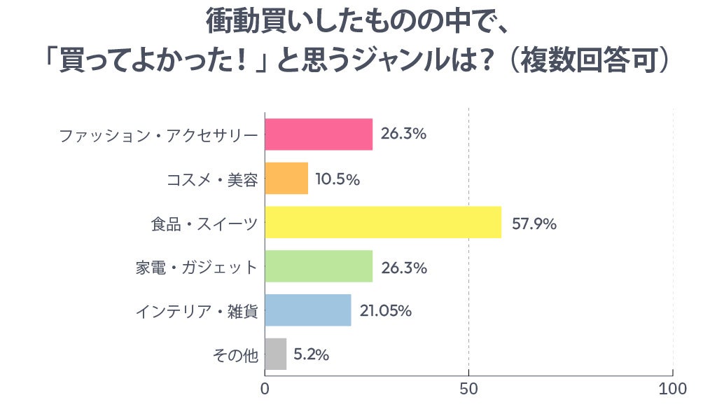 調査では、衝動買いの中でも「買ってよかった」と感じる割合が最も高かった商品カテゴリーは、「食品・スイーツ」であることが分かったと報告されています。
