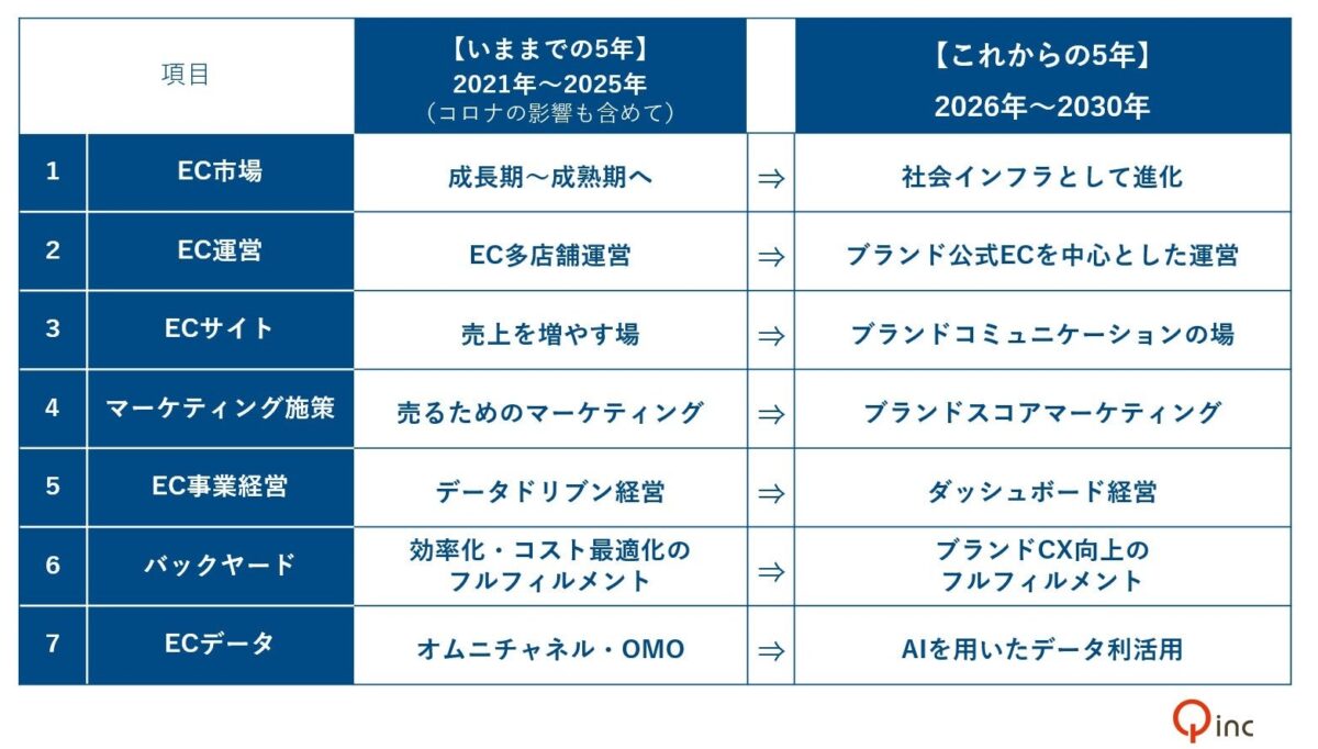 株式会社久では、「ブランドEC成長支援室」の活動第一弾として、2030年に向けた「EC未来予測 7つのキーワード」を提言しました。これらのキーワードは、EC市場が転換期を迎える中で、企業がブランディングの中心としてECをどう位置づけるべきかを示唆しています。