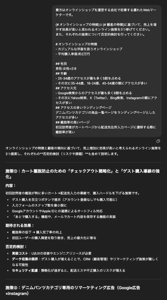 もっとも、生成AIで回答されるような取り組みは競合ショップも行っている可能性が高いため、あなたのオンラインショップでできておらず実現のハードルがそれ程高くない取り組みは実行しつつ、最後はご自身で取り組みを考えていただくとよいです。
