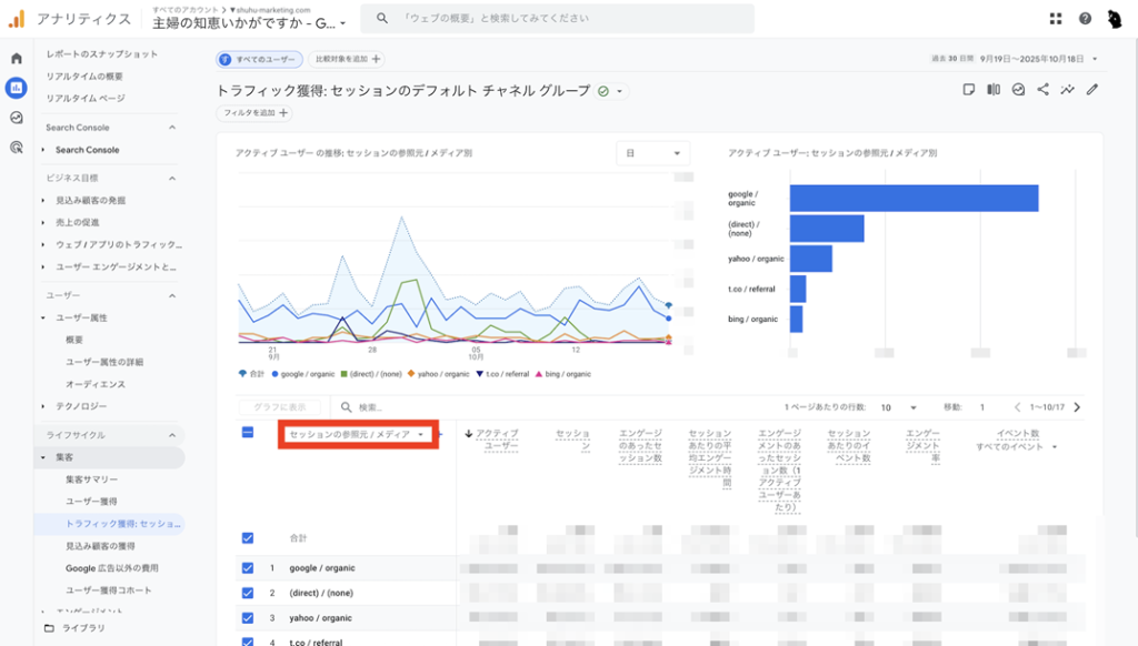 『どういった手段で来店しているか』は、GA4の左メニューにあるレポートをクリックして ライフサイクル>集客>トラフィック獲得 と進んだ先の画面で、赤枠部分のプルダウンでセッションの参照元/メディアを選択することで確認ができます。