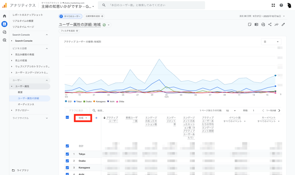 これらは、GA4の左メニューにあるレポートをクリックして ユーザー>ユーザー属性>ユーザー属性の詳細 と進んだ先の画面で、赤枠部分のプルダウンを変更することで確認ができます。