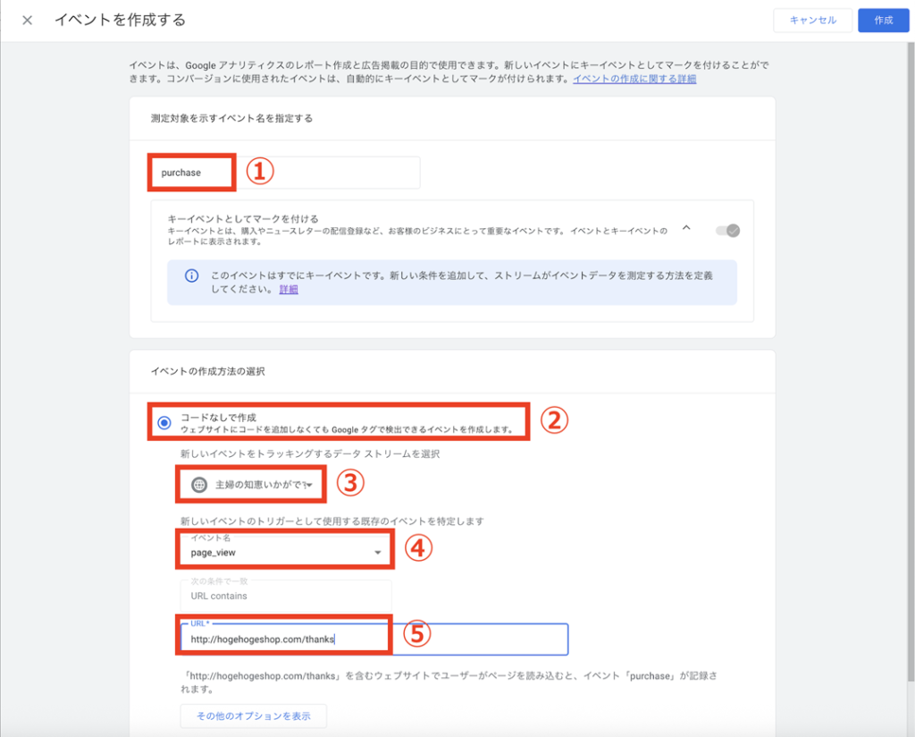 一方『purchase』の右側(赤枠部分)が「ストリーム データが検出されませんでした」という表記になっている場合は、画面上部の「イベントを作成」をクリックして、次の画面のような設定をしましょう。