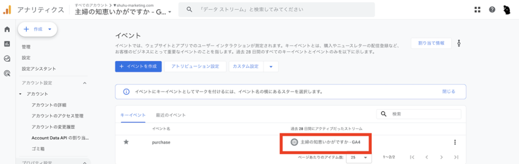イベント名『purchase』の右側(赤枠部分)にプロパティ名が記載されていれば、正しくキーイベントが設定されています。(キーイベントとして『purchase』以外が表示されている場合は、イベント名の頭についている星マークをクリックし、キーイベントの設定を解除しておきましょう)