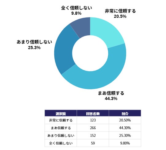 内訳を見ると、「非常に信頼する」と答えた回答者が20.5%、「まあ信頼する」と回答した層が44.3%と、高い信頼感を示すグループが大多数を占めています。