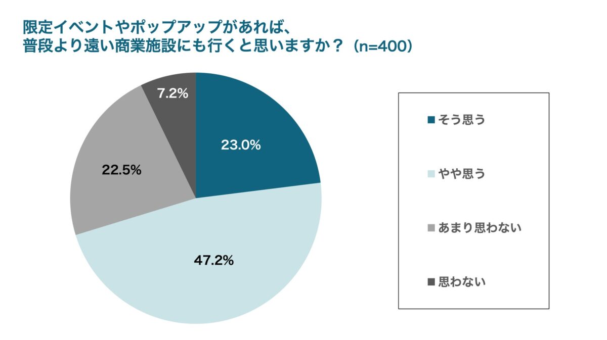 また、「限定イベントやポップアップがあれば、普段より遠い商業施設にも行くと思う」という質問に対しては、約7割("そう思う"と"やや思う"の合計)が肯定的な回答を示しており、Z世代にとってポップアップイベントが"行動距離を伸ばす誘因"としても機能していることが明らかになっています。