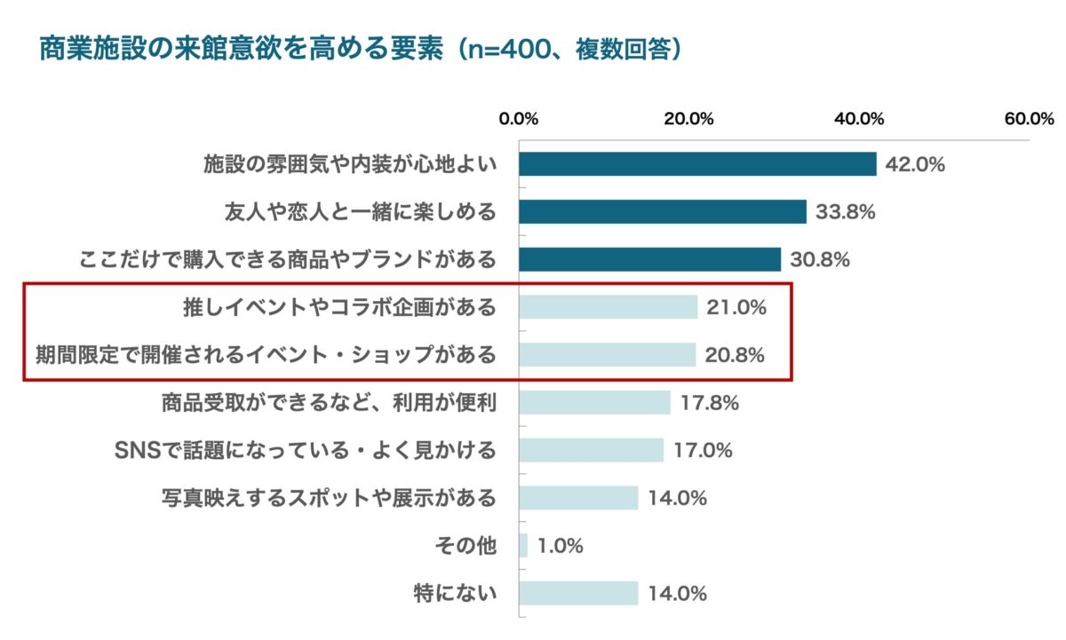 調査では来館意欲を高める要素についても質問が行われました。その結果、「施設の雰囲気や内装が心地よい」(42.0%)が最も高い割合を示し、「友人や恋人と一緒に楽しめる」(33.8%)、「ここだけで購入できる商品・ブランドがある」(30.8%)がTOP3となりました。加えて、「推しイベントやコラボ企画がある」(21.0%)、「期間限定で開催されるイベント・ショップがある」(20.8%)といった、"推し・コラボ・期間限定"の要素も2割前後を占める重要な来館動機となっていることが報告されています。