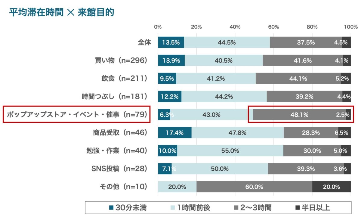 - 来館目的としては、従来の買い物や飲食を超えて「ポップアップストア」の存在が長時間滞在を促す重要な要素となっていることが明らかになっています。