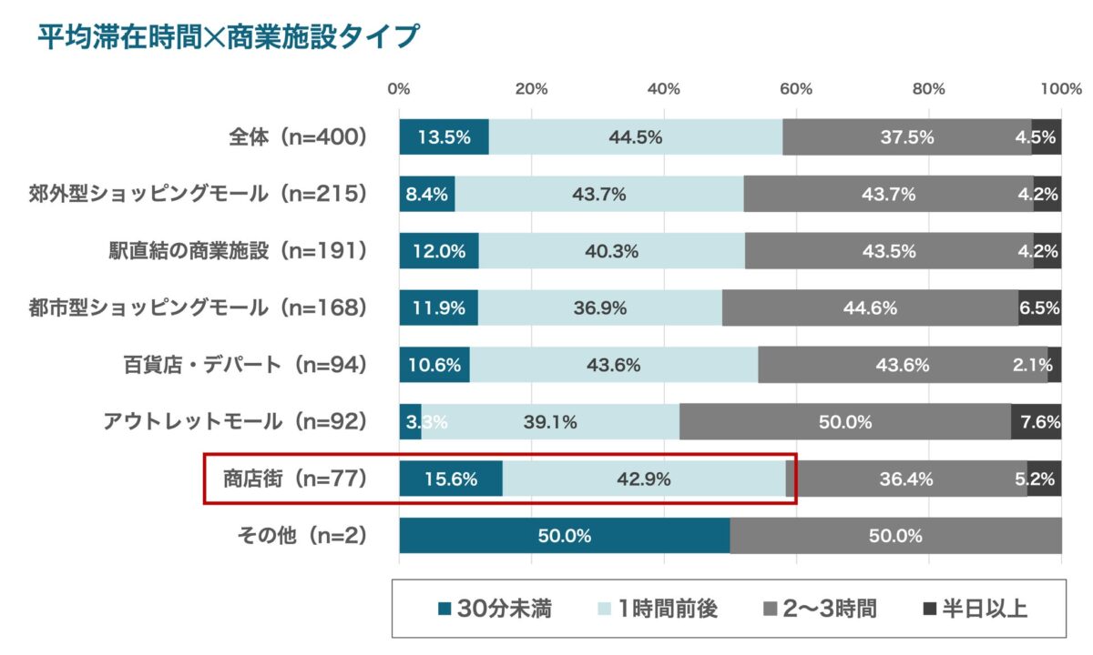 さらに施設種別ごとの平均滞在時間を分析すると、「商店街」では短時間利用("30分未満"、"1時間前後"の合計)が58.5%と最も高く、"サクッと立ち寄る"利用スタイルが中心となっていることが判明しています。一方、「アウトレットモール」では"2〜3時間"の滞在が相対的に高い割合を示しており、滞在を楽しむ目的地型の利用傾向が見られるとのことです。