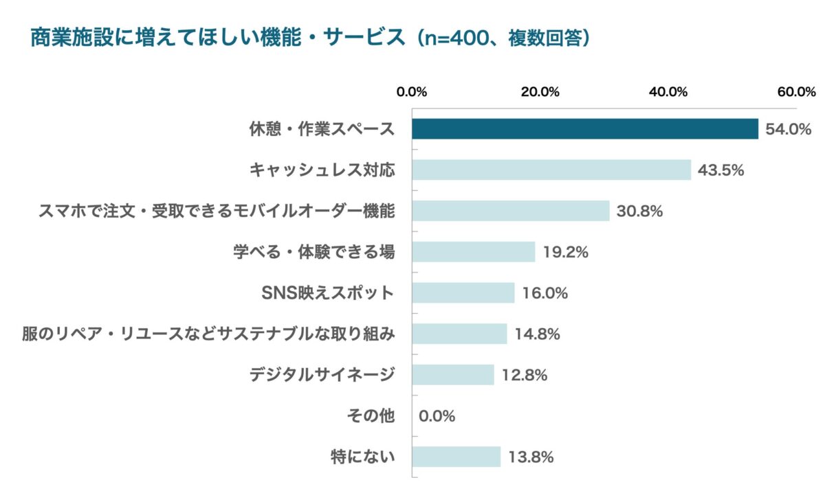 調査では商業施設に増えてほしい機能・サービスについても質問が行われました。その結果、「休憩・作業スペース」(54.0%)が最も高い割合を示し、次いで「キャッシュレス対応」(43.5%)、「スマホで注文・受取ができるモバイルオーダー機能」(30.8%)が続いたことがわかります。また、「SNS映えスポット」(16.0%)や「服のリペア・リユースなどサステナブルな取り組み」(14.8%)なども一定の支持を集めており、利便性だけでなく価値観や自己表現への共感を重視する傾向も明らかになりました。Z世代は効率性と快適性を基本としながらも、自分らしさを感じられる体験を求めていることがうかがえます。