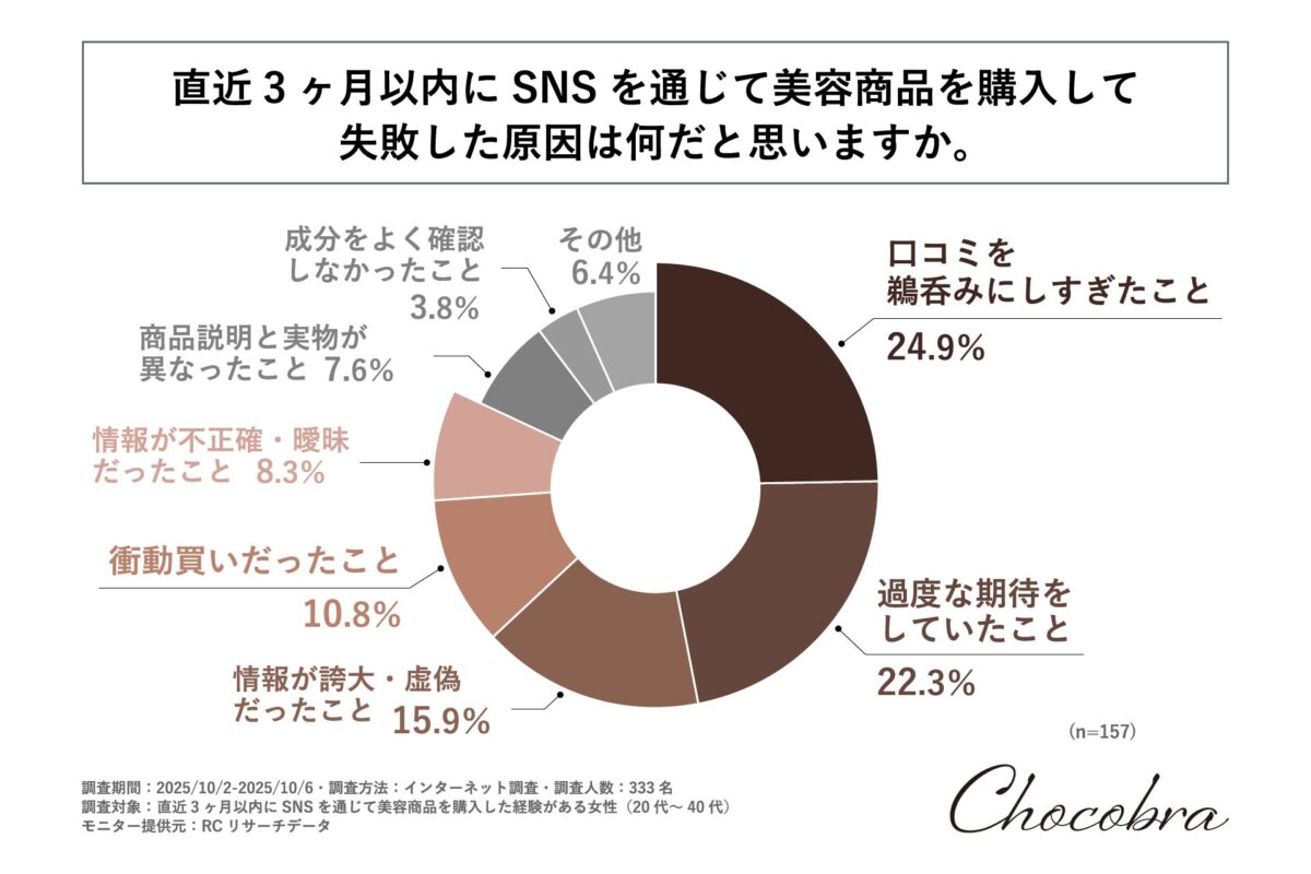 また、SNSで美容商品を購入して「失敗したと感じる人」にその根本的な理由を尋ねたところ、1位が「口コミを鵜呑みにしすぎたこと」で24.9%、2位が「過度な期待を抱いていたこと」で22.3%、3位が「情報が誇大または虚偽だったこと」で15.9%という結果が得られました。このことから、失敗の要因の多くが「口コミを鵜呑みにしすぎたこと」や「過度の期待」によることが明らかになりました。