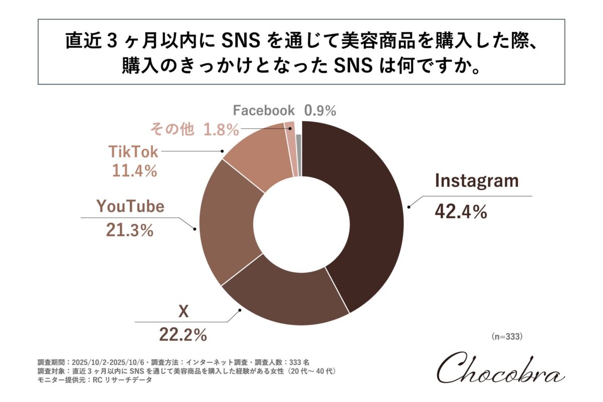 調査によると、「最近の3ヶ月以内にSNSを通じて美容商品を購入した際のSNSのきっかけ」について、1位が「Instagram」で42.4%、2位が「X」で22.2%、3位が「YouTube」で21.3%となりました。この結果は、多くの女性が美容商品購入の際に「Instagram」を重視していることを示しています。