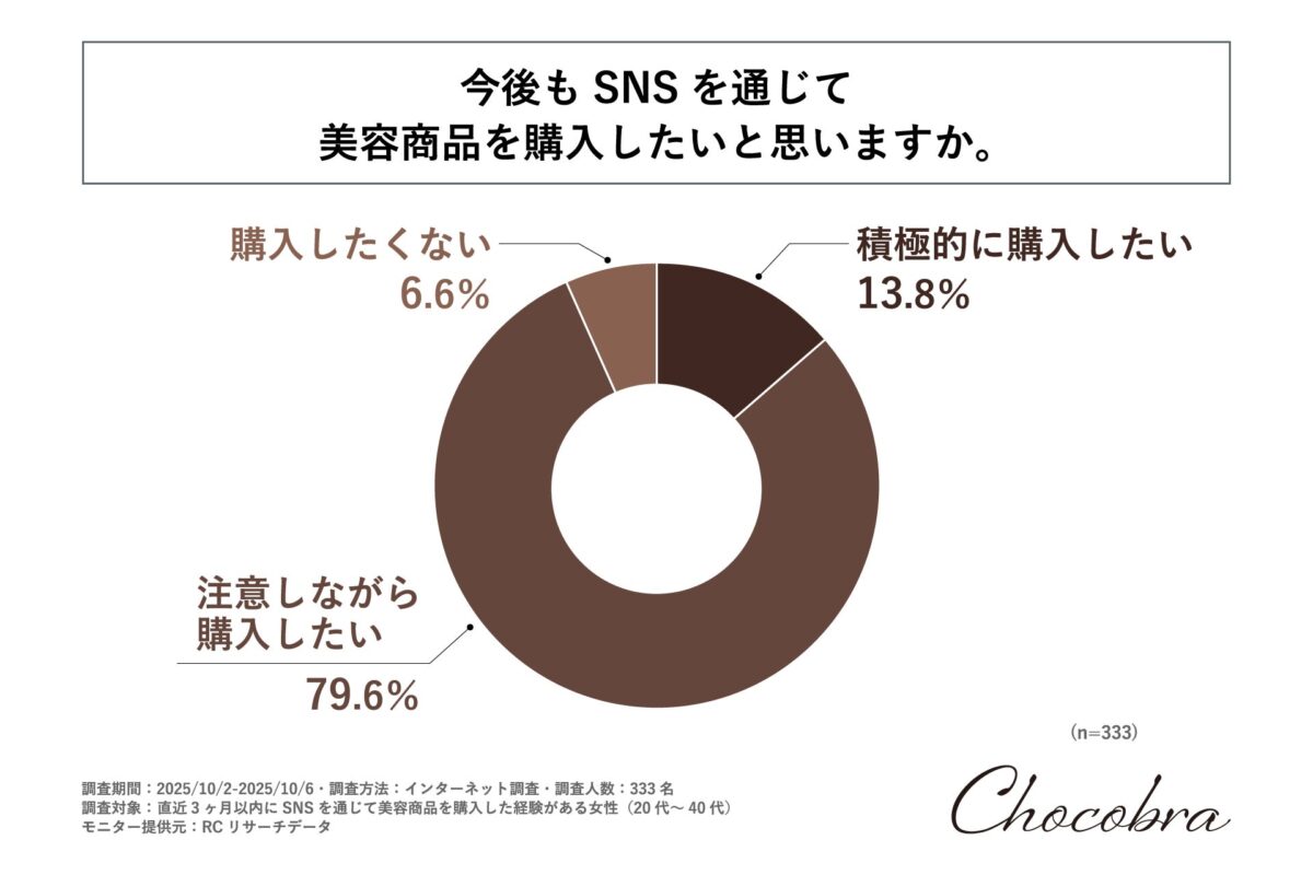 調査の最後に「今後もSNSを通じて美容商品を購入したいか」を問いかけたところ、1位が「注意しながら購入したい」が79.6%、2位が「積極的に購入したい」が13.8%、3位が「購入したくない」が6.6%という結果となりました。これにより、1位と2位を合わせると90%を超える女性が今後もSNSを通じて美容商品を購入したいと考えていることが示されました。