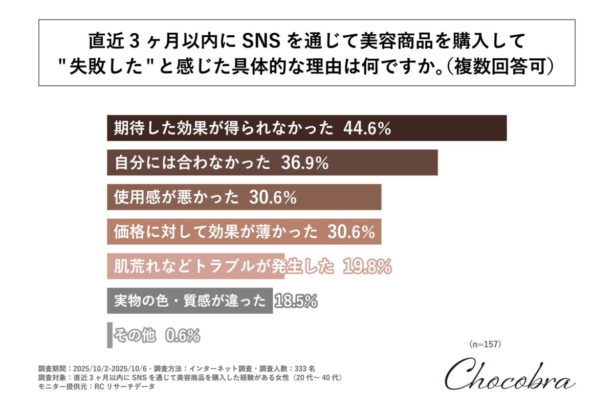 さらに、「SNSを通じて美容商品を購入して失敗したと感じる具体的な理由」を尋ねると、1位が「期待した効果が得られなかった」が44.6%、2位が「自分には合わなかった」が36.9%、3位が「使用感が悪かった」と「価格に対して効果が薄かった」が同率で30.6%と回答されています。これは、失敗したと認識される理由が主に「期待した効果が得られなかった」や「自分には合わなかった」という点に収束していることを示しています。