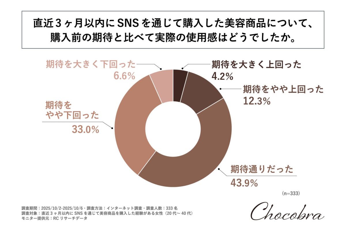 また、「最近の3ヶ月以内にSNSを介して購入した美容商品が、購入前の期待に対してどうだったか」という設問では、43.9%の女性が「期待通りだった」と回答し、33.0%が「期待をやや下回った」、12.3%が「期待をやや上回った」、6.6%が「期待を大きく下回った」としています。これは、約4割の女性が実際の使用感に対して期待を下回ったと感じていることを示しています。