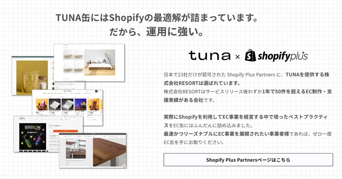 【 tuna 】ECパッケージで本格支援するチームRESORTが手がける、運用に強いShopifyのEC構築パッケージの名称です。「tuna-THE EC缶」は自らEC事業を運営している会社が導き出した、ECのノウハウ、経験値を凝縮。多くの企業がハマる落とし穴を事前に塞ぎ、事業成長及び拡大への最短距離を提示するとのことです。