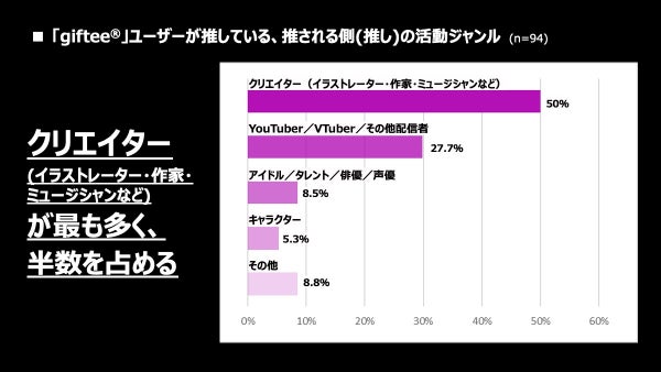 • 回答者のうち、「推される側」の活動内容やジャンルは、「クリエイター(イラストレーター・作家・ミュージシャンなど)」が最多の50%。YouTuber/VTuberなどの配信者が約28%と続きました