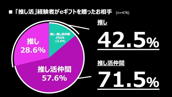 • eギフトの贈り先は「推し活仲間」が約57%、「推し」が約29%、「推しと推し活仲間の両方」と回答した方が約14%