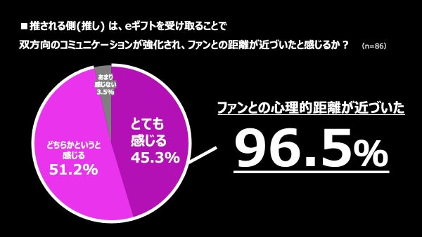 • eギフトをファンから受け取ることで、双方向のコミュニケーションが強化され、ファンとの距離が近づいたと実感した人は約97%と圧倒的な結果になっています