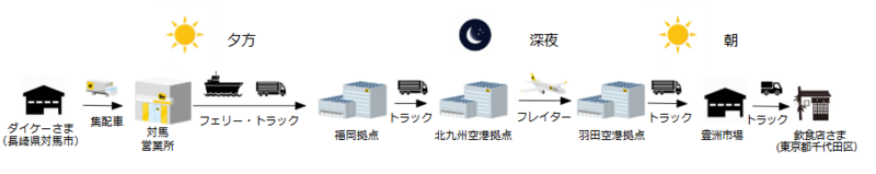 このサービスでは、長崎県対馬市で水揚げされた活魚を、深夜の貨物専用機で輸送し、翌日には東京都内の飲食店などに生きたまま届けられるようになりました。これにより、遠隔地の新鮮な活魚を小ロットで効率的に輸送する新たな物流手段が実現しています。