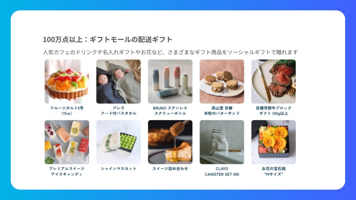 特長1: ソーシャルギフトで贈れる商品は100万点以上