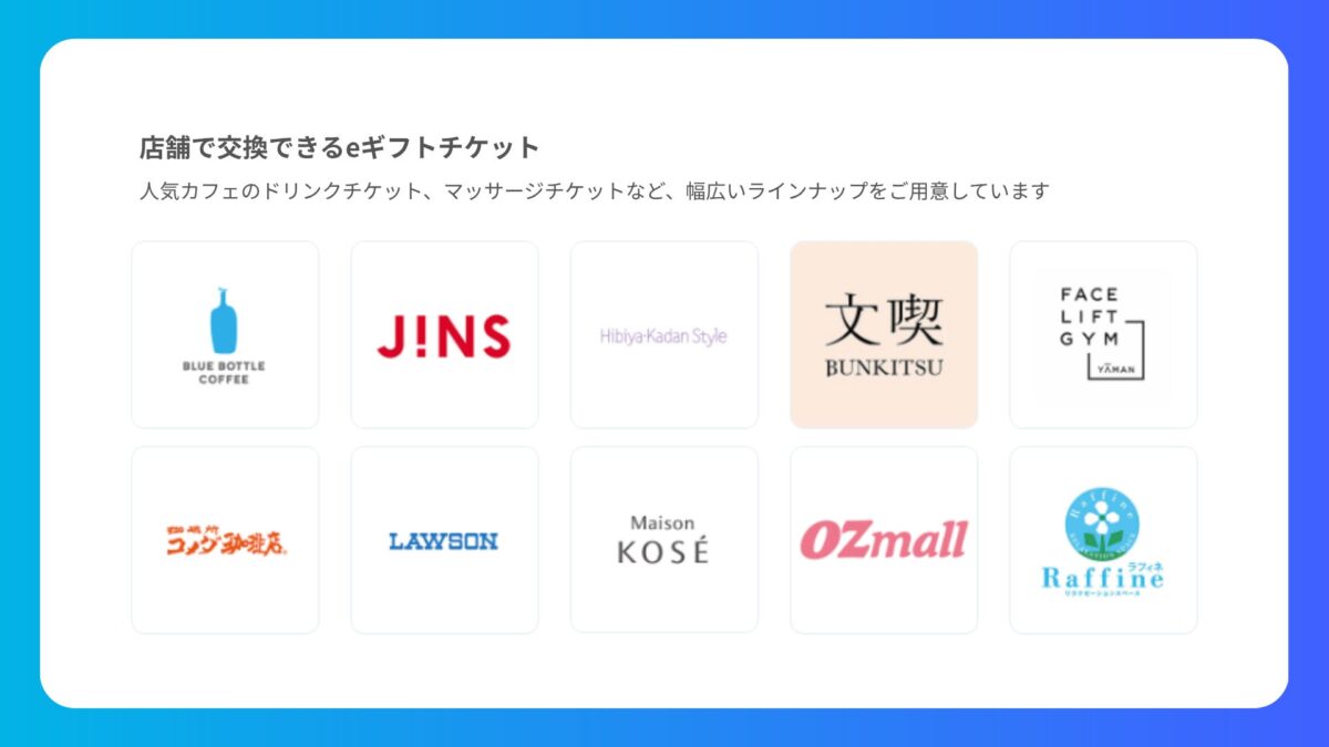 業界最大級である100万点以上のソーシャルギフト対応商品を揃えており、モノギフト(実物の商品)からデジタルギフト(eギフトや店頭利用可能なチケットなど)まで幅広いニーズに応えています。ソーシャルギフト商品が豊富だからこそ、贈る相手の趣向やシーンに最適なギフトが選べます。